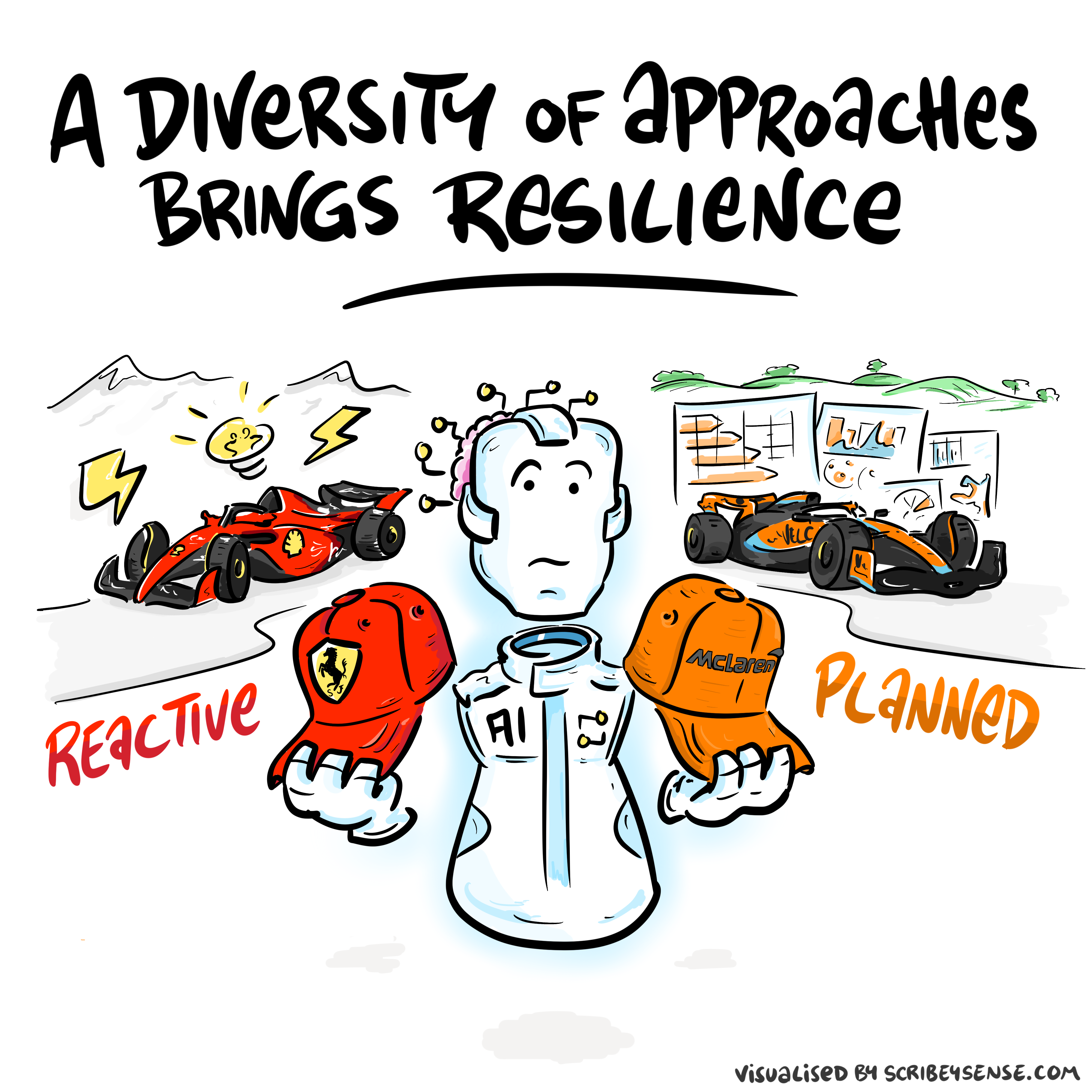 Individuals and cultures can be more dominated by their reflexive or their reflective self. The arguments I make in The Gremlin of Uncertainty suggest that McLaren and Ferrari (in previous incarnations when then were dominating the F1 championship) were respectively dominated by planning and improvisational approaches. Similarly, I describe my father and brother’s approach as being respectively dominated by planning and improvisational approaches. There’s even a roundabout connection to how an individual chooses to react to a situation, with a reflexive or a reflective response. What Kahneman called slow or fast thinking.