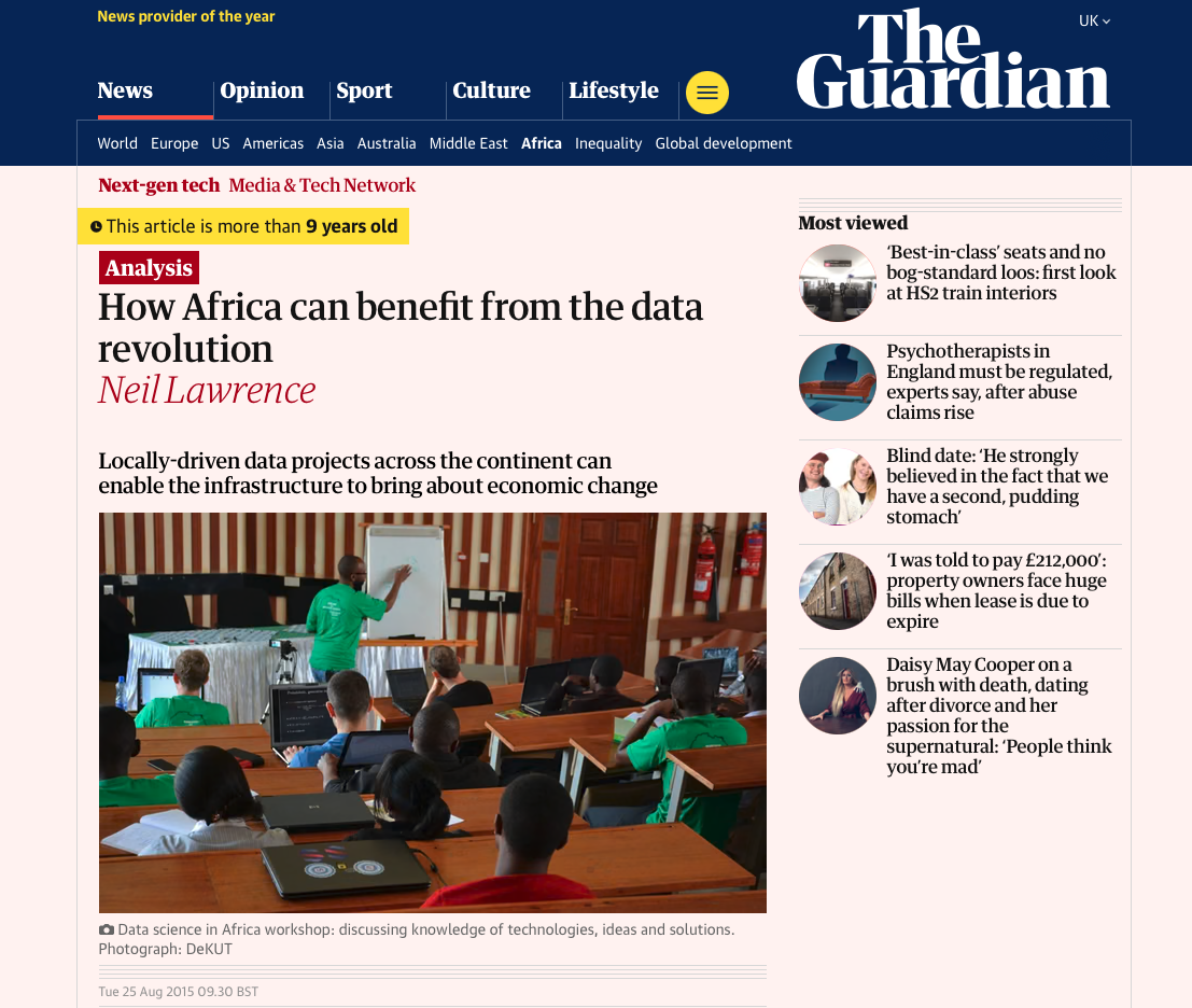 The philosophy is laid out in (Lawrence, 2015). The key idea is that the modern information infrastructure presents new solutions to old problems. Modes of development change because less capital investment is required to take advantage of this infrastructure. The philosophy is that local capacity building is the right way to leverage these challenges in addressing data science problems in the African context.