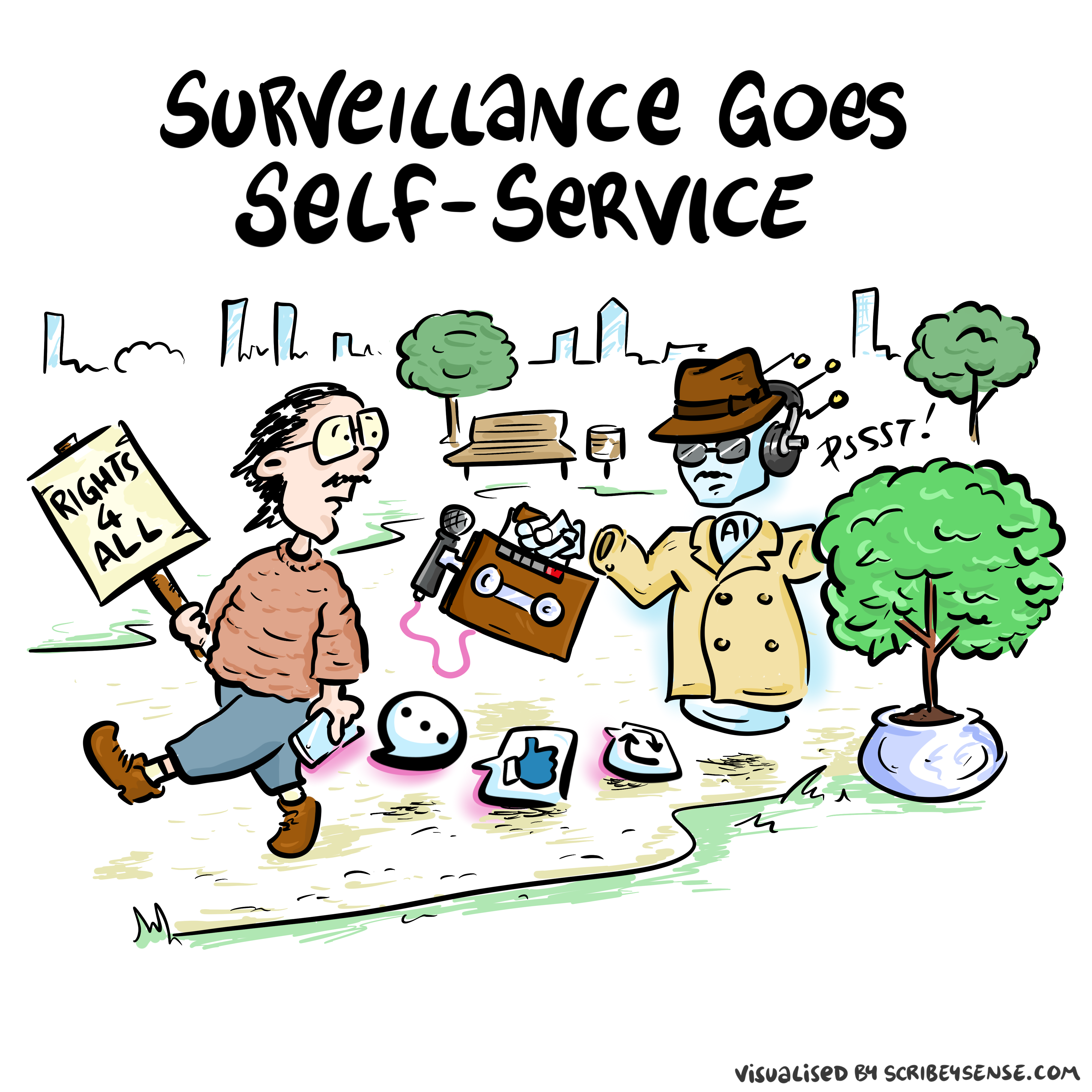 Figure: This is the drawing Dan was inspired to create for Chapter 10. The warning suggests that we should be wary of large companies that accumulate power through vast accumulation of our personal data. Today, with the advent of generative AI, we could add “our creative data” to this. It calls the power structures that result the “digital oligarchy”.