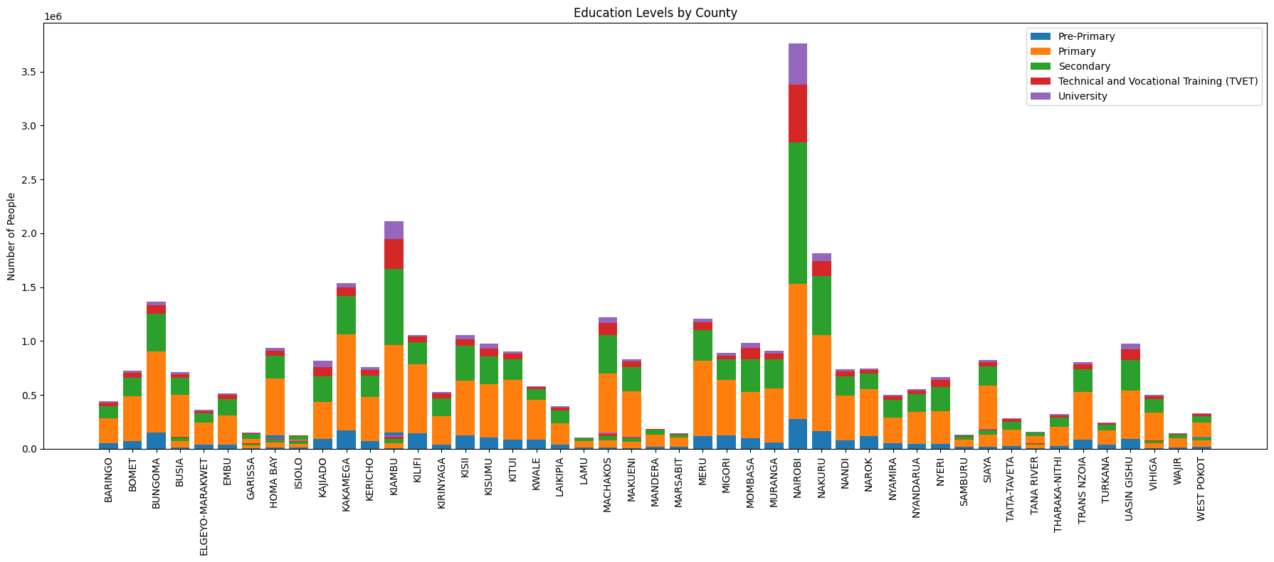 The project follows the Fynesse pipeline in three stages. Access was the most challenging. I initially planned to work at the sub-county level, but reliable data simply was not available. I had to extract school information from multiple websites and PDFs. I also obtained the 2019 Census population and education data from the Kenya National Bureau of Statistics. This process highlighted how desperately Kenya needs better systems for managing educational statistics. In Assess, I explored the data to understand patterns in education levels across counties. The variations were striking: some counties had significantly higher proportions of educated residents, while others lagged far behind. As shown in this graph ( Education levels by county.png)