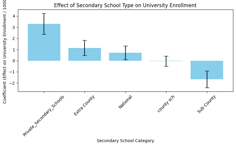 (Effect of secondary school type to university enrolment.png) I also examined how secondary school quality affects university enrolment. In Kenya, schools range from elite National and Extra County schools to local County and Sub-County schools, plus Private schools with varying standards. The analysis reveals that Private high schools have the strongest impact on university enrollment (coefficient: 3.3), followed by Extra County high schools (1.2) and National high schools (0.7). County and Sub-County schools show minimal effects, confirming that access to higher-quality secondary education significantly shapes pathways to university.
