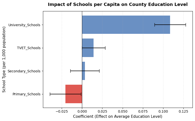 In the Address stage, I built linear regression models to quantify the impact of different types of schools on county education outcomes. Concepts from Professor Neil’s lectures on statistical modelling were particularly useful in structuring my analysis and interpreting the regression results. The first model used the number of schools per 1,000 people for each category (Primary, Secondary, TVET, University) as inputs, ensuring fair comparison by measuring access rather than raw counts. The target was a weighted average education level, with weights from Primary (1) to University (4), essentially asking, on average, how educated people in each county are. All features were standardized to allow fair comparison across school types.( Impact of schools per capita on county education level.png) Results show universities have the strongest positive effect (coefficient: 0.11), while TVET (0.016) and Secondary (0.002) have modest impacts. Primary schools appear negative (-0.021), likely due to multicollinearity, as less educated counties have proportionally more primary schools. The model (R² = 0.68) suggests that school distribution, especially university access, relates to county education outcomes. This doesn't mean residents of counties without universities avoid higher education. Rather, they study elsewhere and often don't return.