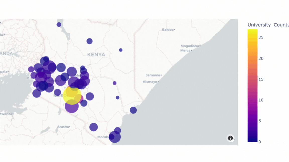 To illustrate how universities concentrate educational attainment, I created an interactive map of Kenya. The bubble size represents the proportion of university-educated residents, while colour intensity shows the number of universities in the county. (University distribution and level of education.gif) Nairobi and parts of central Kenya (yellow/orange) dominate with both the most universities and the highest-educated populations. Meanwhile, counties like Nyandarua (dark blue) have no universities and correspondingly smaller university graduate populations. The animation reveals what the regression confirmed: universities do not only educate; they also attract and retain educated people, creating regional disparities that persist across generations.