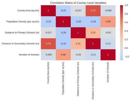 Population density shows a moderate positive correlation with the number of schools. Where more people live closer together, there are more schools. It also has a negative correlation with distance to schools, meaning denser areas have shorter travel distances.