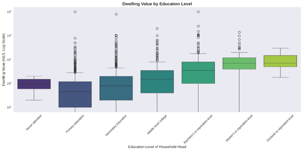 So, what's the payoff for all this schooling? Since employment data was confidential, I looked at the house value. As the education level of the household head rises, so does the median value of their home. The more educated the head of the household, the higher the rent they can afford and the more valuable their owned home. This is strong indication that education translates into a better quality of life.
