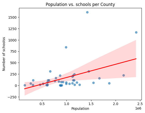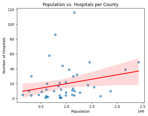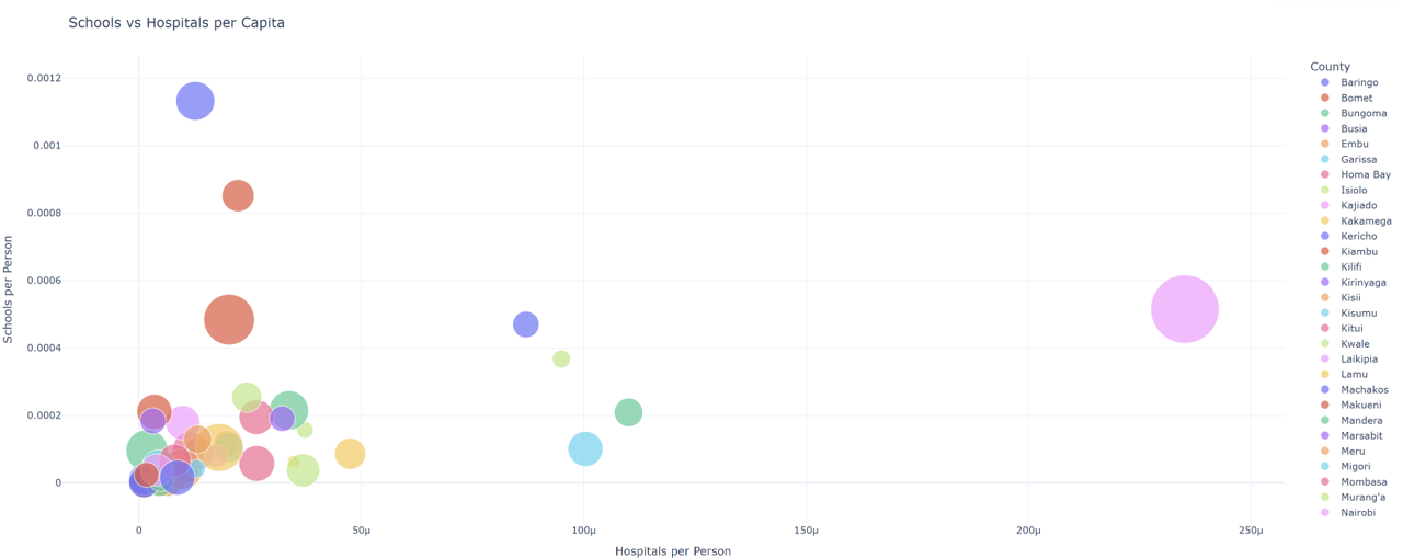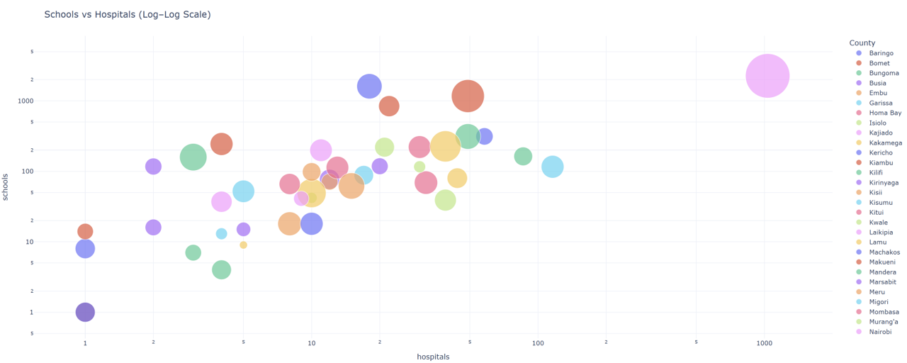 When comparing the number of schools and hospitals against population, the disparities become even clearer. Counties with high populations often have relatively fewer public facilities, meaning more people compete for fewer services. To visualise this imbalance, we created a bubble plot of the number of hospitals and schools, where each bubble’s size represents population.
