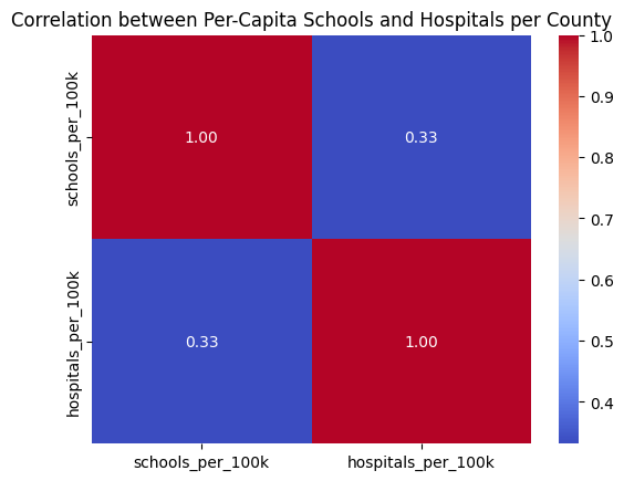 The bubble plot and correlation analysis tell a clear story: population correlates moderately with the number of schools, but less so with hospitals. This means that while educational facilities have somewhat scaled with growth, healthcare infrastructure has lagged. Counties like Mandera and Wajir, for example, show high population but very few hospitals per capita.