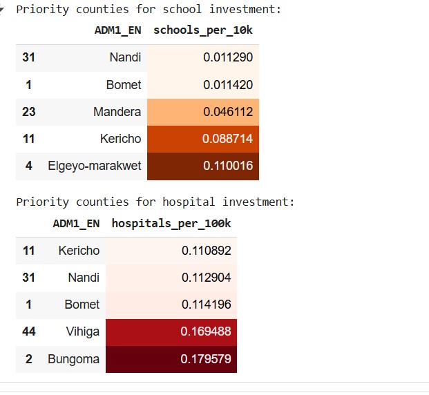 Regions like Kericho, Nandi, and Mandera remain underserved, while urban areas such as Nairobi and Kiambu have dense concentrations of schools and hospitals. This project combines geospatial data, statistical analysis, and visualisation to reveal these disparities and spark conversations around equity in essential infrastructure.